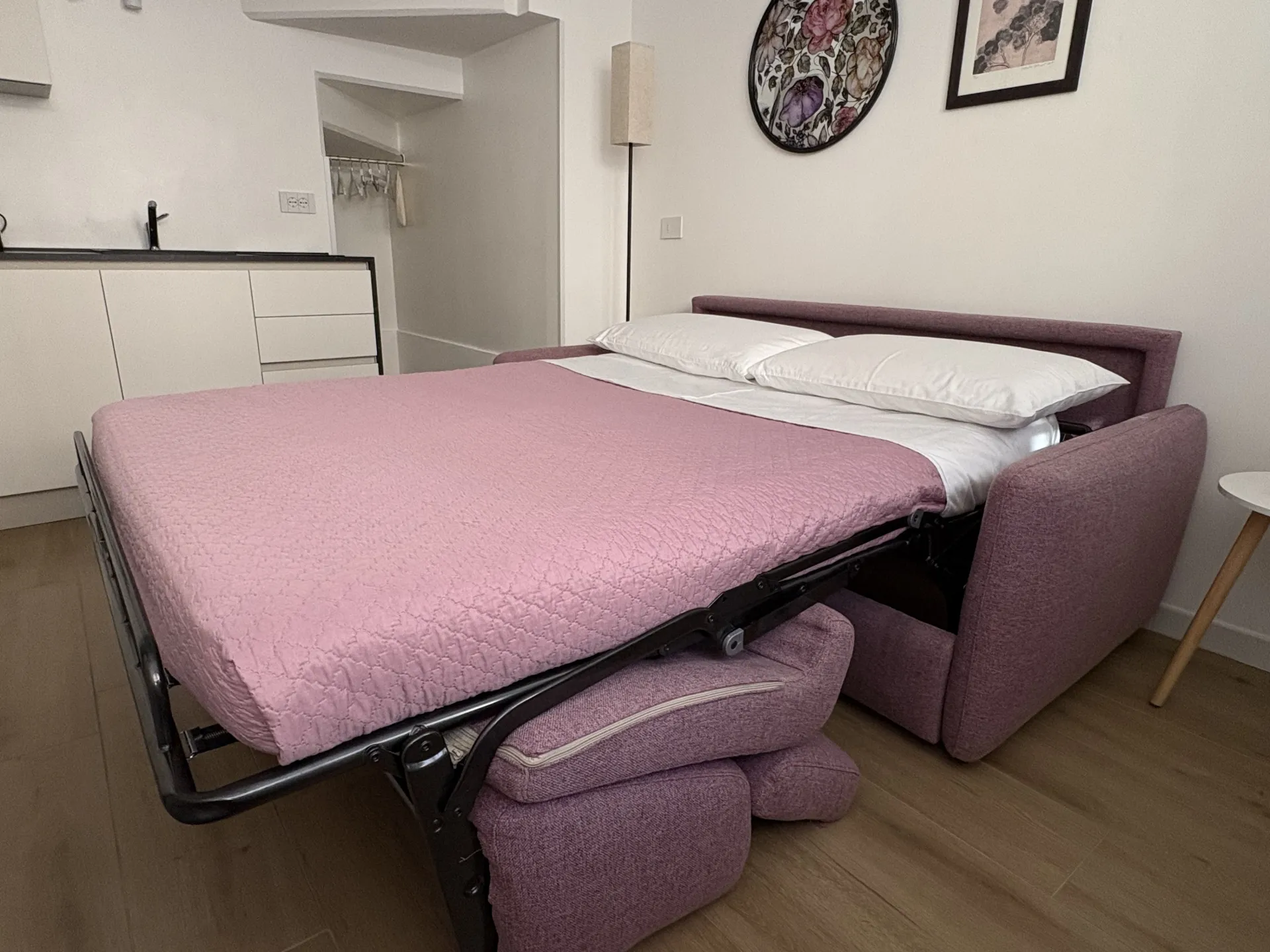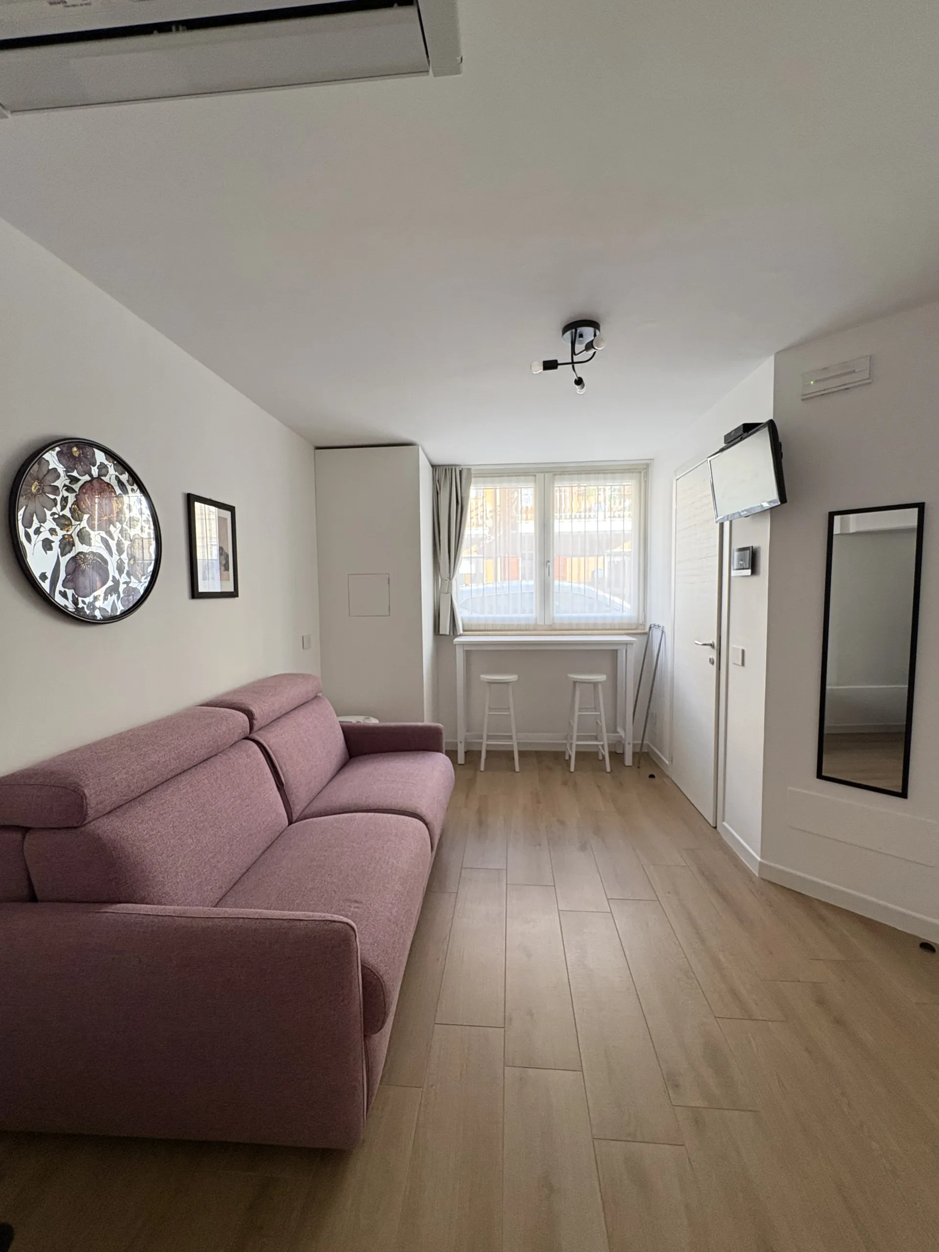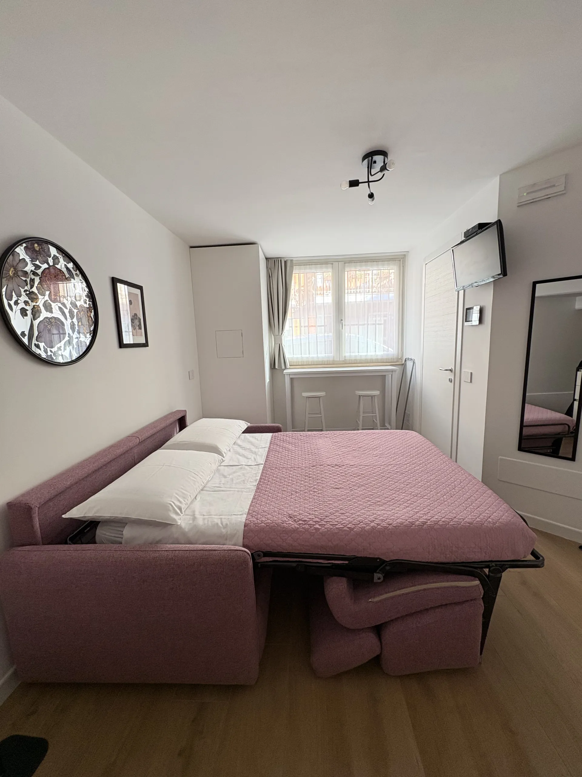 L’alloggio, di 22 mq, è ideale per ospitare fino a due persone. Accogliente e ben organizzato, è dotato di climatizzazione e riscaldamento e si compone di un unico ambiente con divano letto alla francese, TV a schermo piatto e connessione Wi-Fi. Lo spazio è attrezzato con macchina da caffè Nespresso, frigorifero, lavello e piccolo piano a induzione, mentre un tavolino con due sgabelli è perfetto per colazioni o pasti veloci. Sono inoltre disponibili tutti gli utensili necessari per cucinare in autonomia.