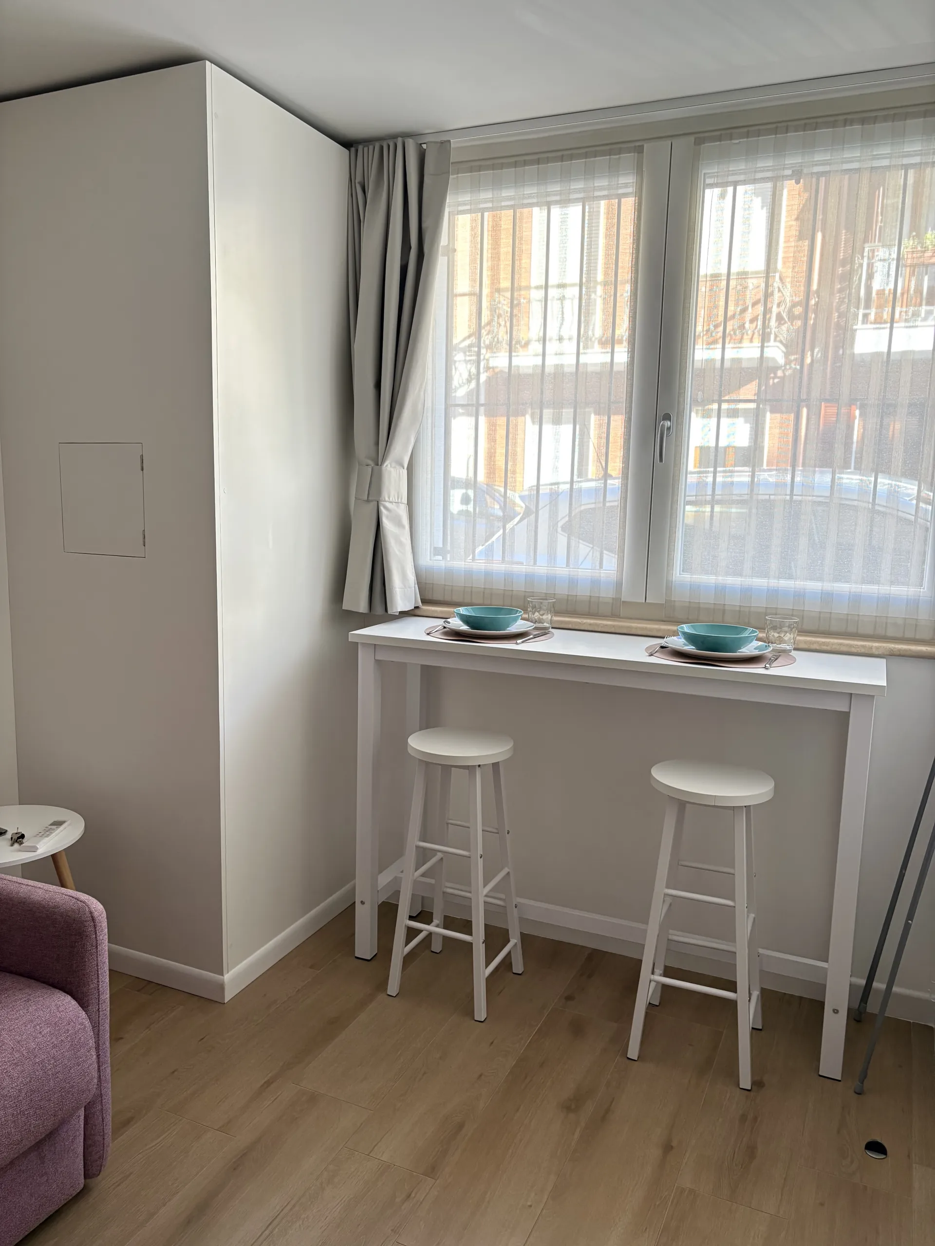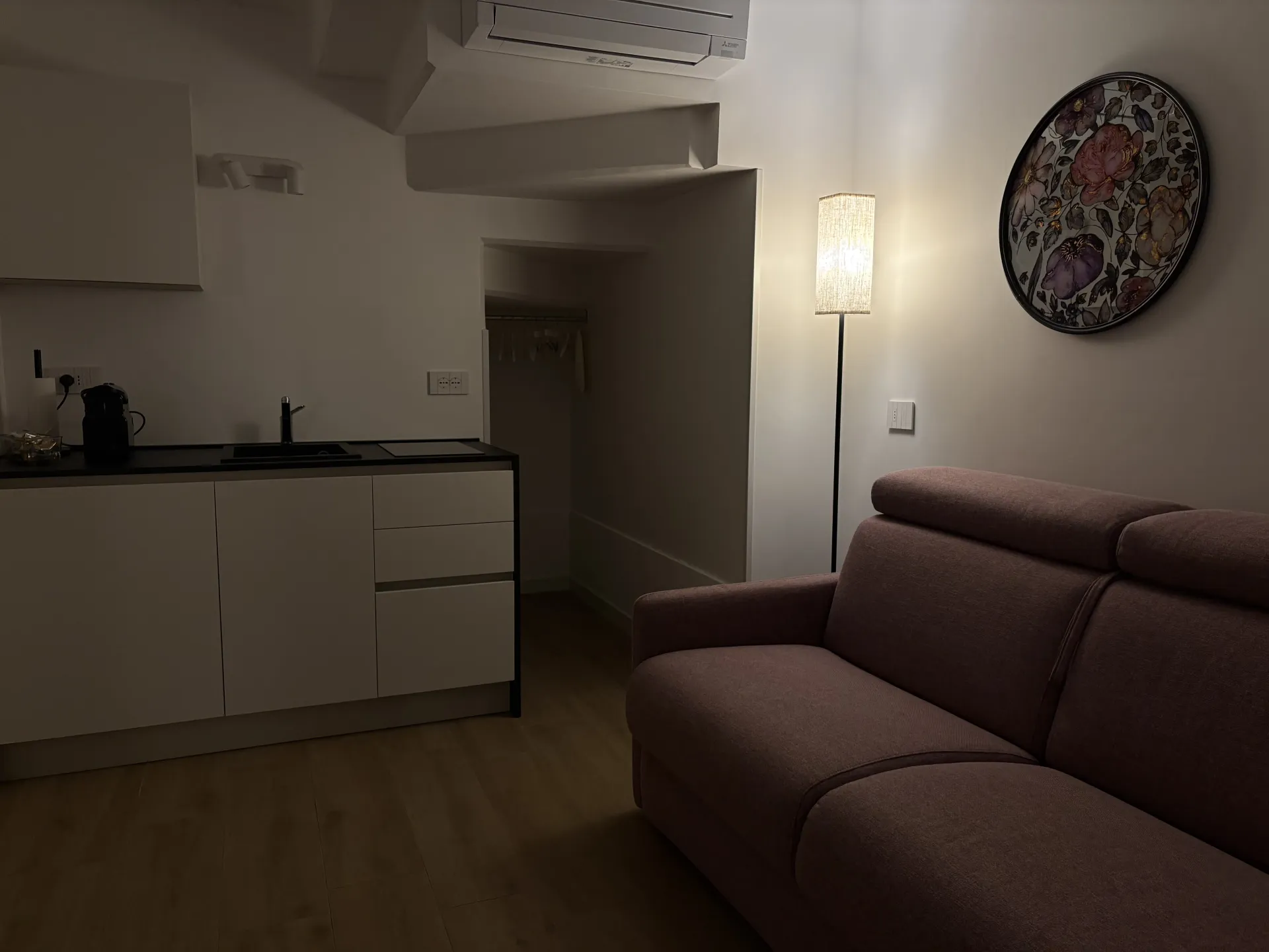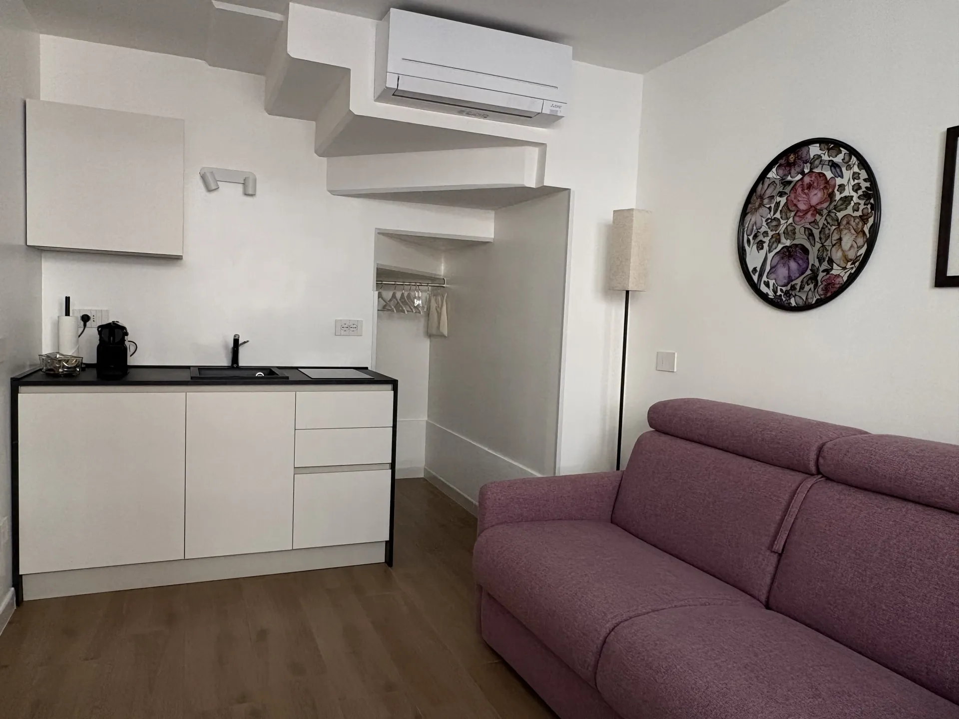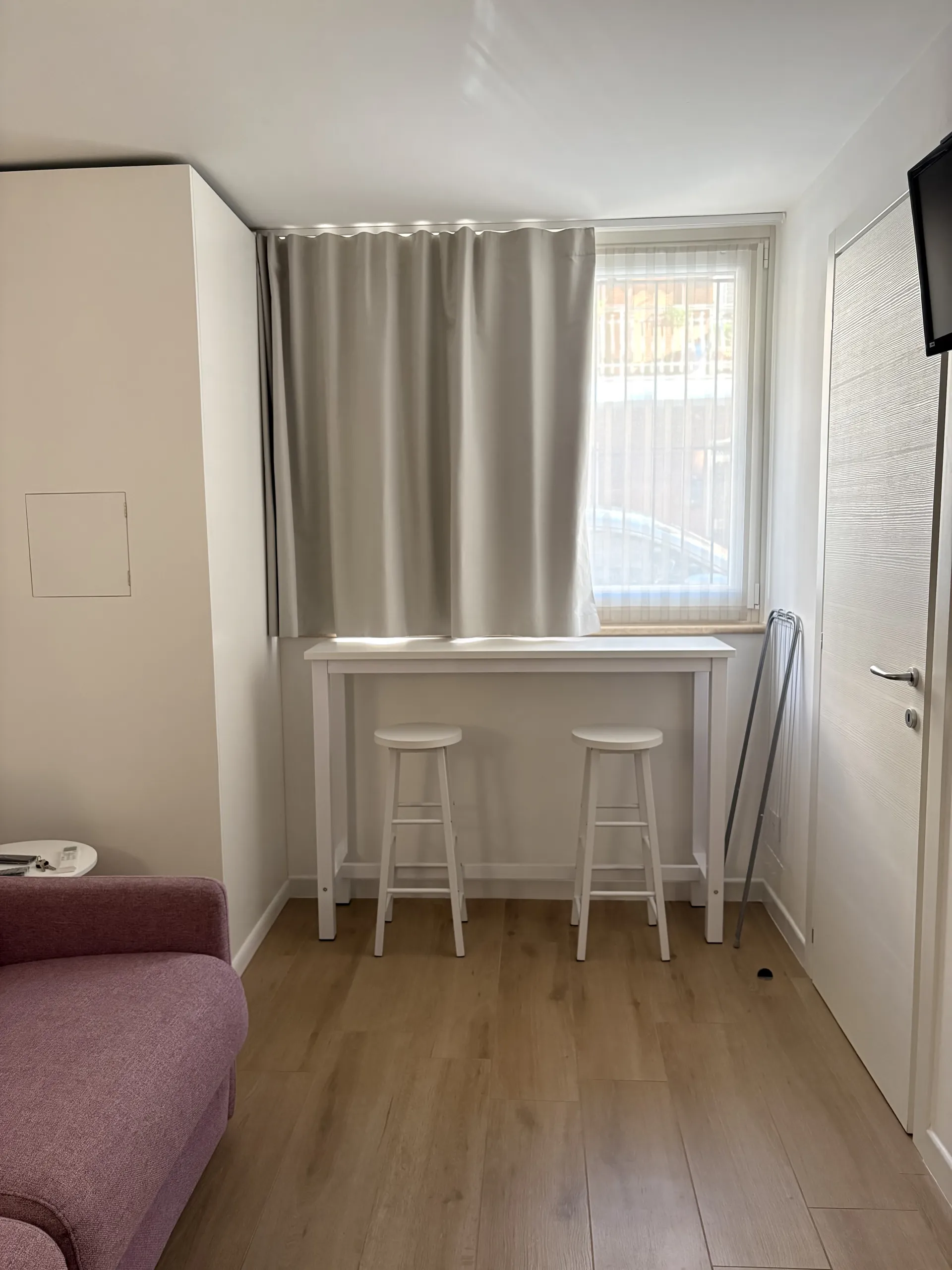 L’alloggio, di 22 mq, è ideale per ospitare fino a due persone. Accogliente e ben organizzato, è dotato di climatizzazione e riscaldamento e si compone di un unico ambiente con divano letto alla francese, TV a schermo piatto e connessione Wi-Fi. Lo spazio è attrezzato con macchina da caffè Nespresso, frigorifero, lavello e piccolo piano a induzione, mentre un tavolino con due sgabelli è perfetto per colazioni o pasti veloci. Sono inoltre disponibili tutti gli utensili necessari per cucinare in autonomia.