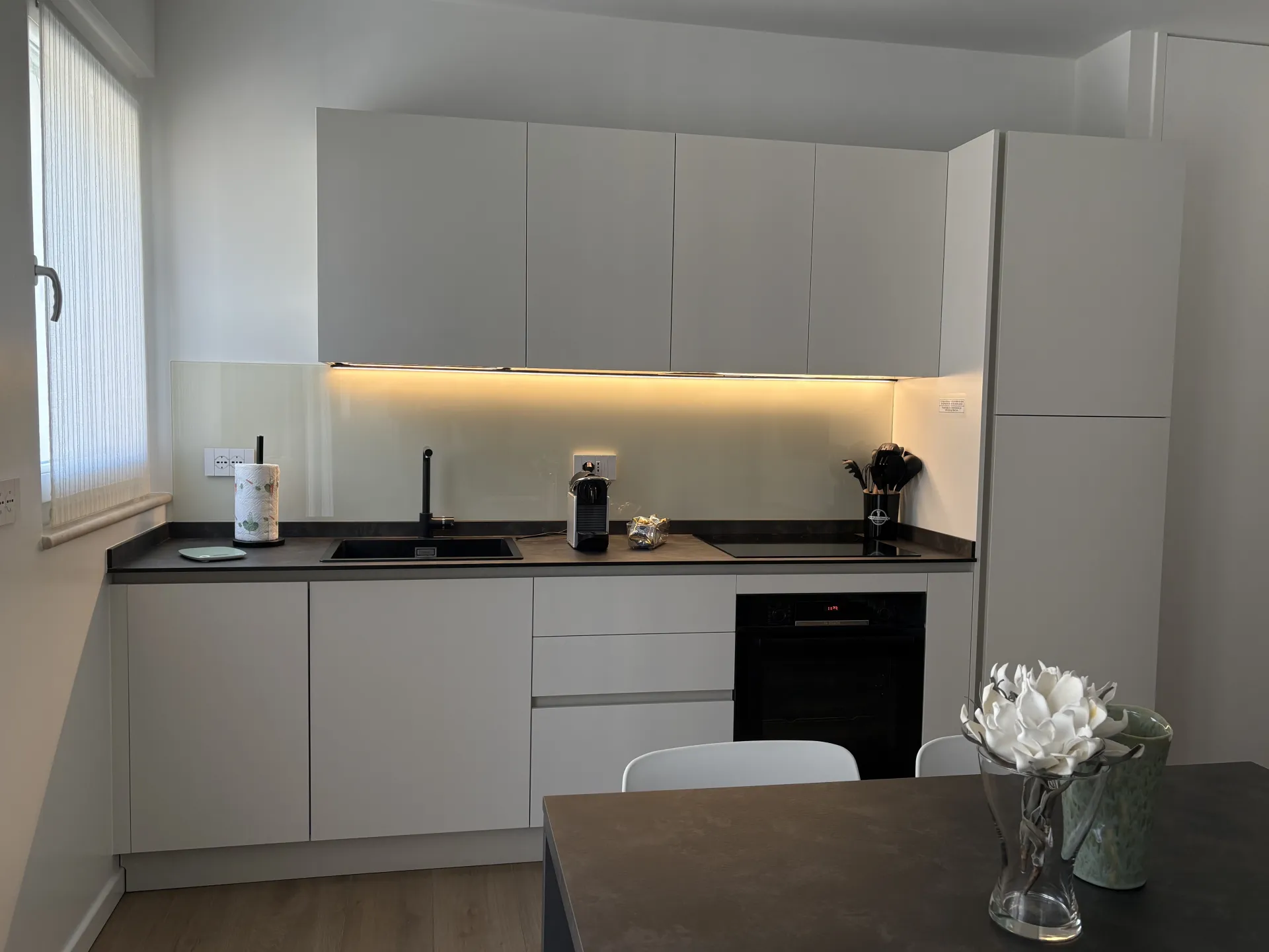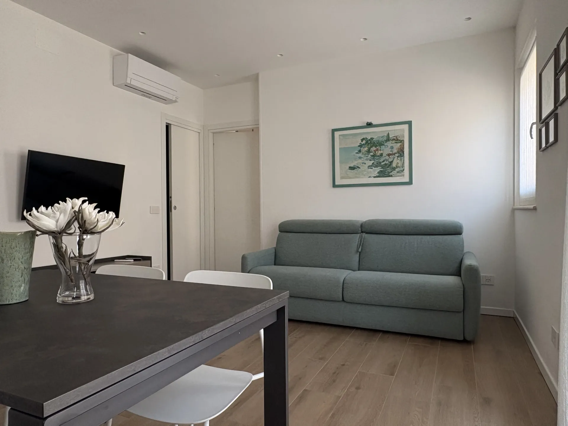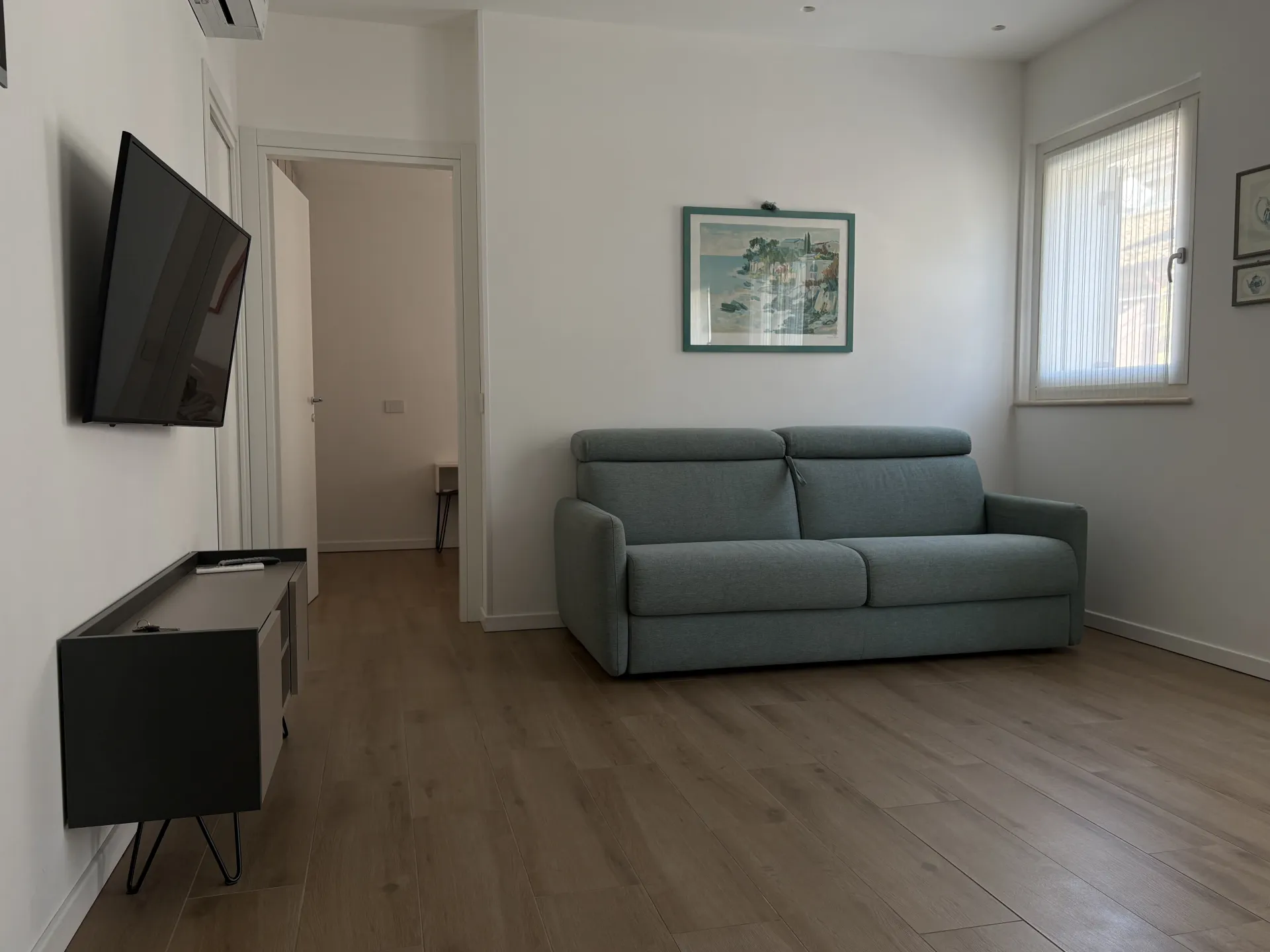 L'appartamento, di 55 mq, può ospitare fino a quattro persone adulte e un bimbo in culla. Accogliente e luminoso, è dotato di impianto di climatizzazione e riscaldamento ed è composto da un soggiorno con divano letto standard, TV a schermo piatto e connessione Wi-Fi, una zona pranzo e una cucina completamente attrezzata, che include lavastoviglie, macchina da caffè Nespresso, frigorifero e tutti gli utensili necessari per cucinare in autonomia. La zona giorno e la camera da letto si affacciano su due piccoli balconcini, ideali per godersi l’atmosfera tranquilla del borgo marinaro.